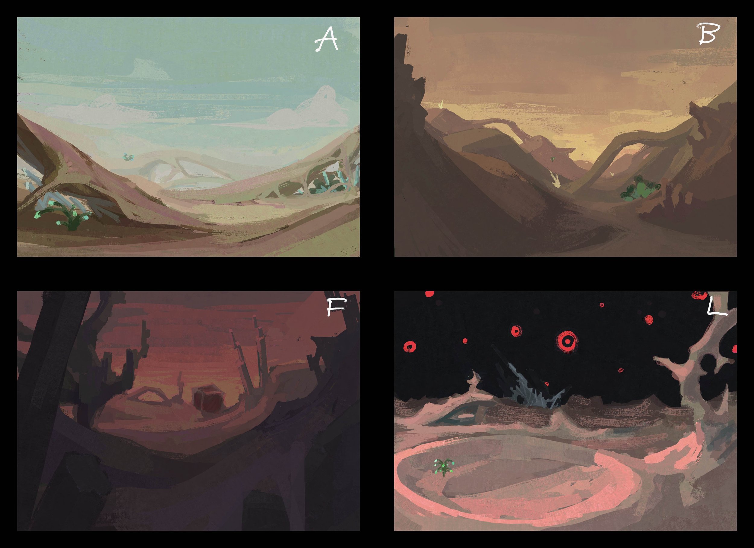 Use of sightlines, landmarks, and terrain composition to direct attention.