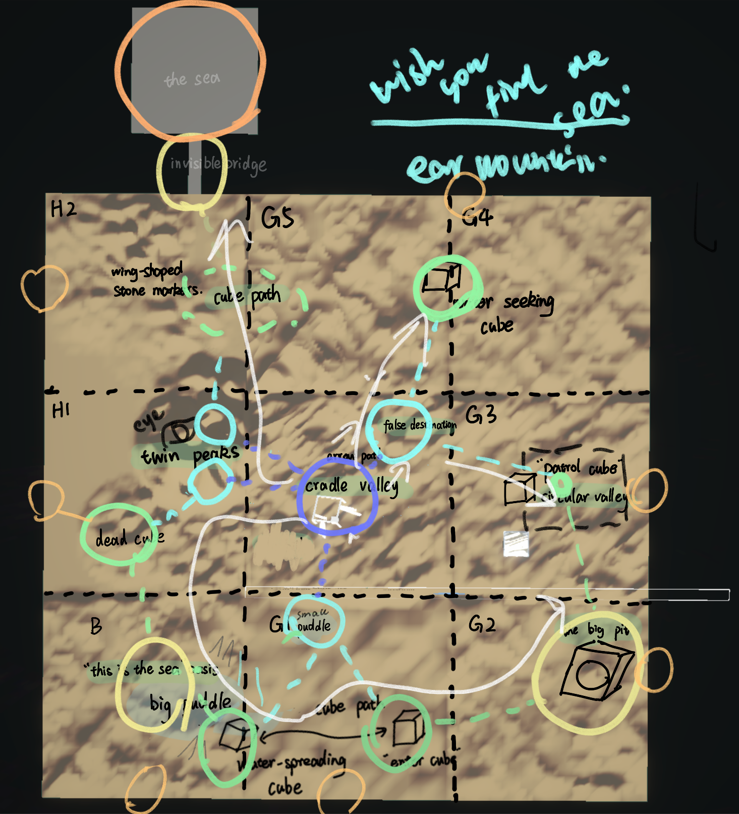 A 3D third-person narrative adventure game about survival and existential anxiety. Players take on the role of a newborn in a mysterious desert world, beginning a journey of exploration and survival. To stay alive, the player must search for scarce water sources while exploring the vast desert in search of the legendary ocean. Along the way, players will gradually uncover the origins and hidden secrets of this strange world. Scattered throughout the desert are colossal cubic entities with unique behaviors and mechanisms. Players must learn how to interact with these massive structures and discover the mysteries hidden behind them.